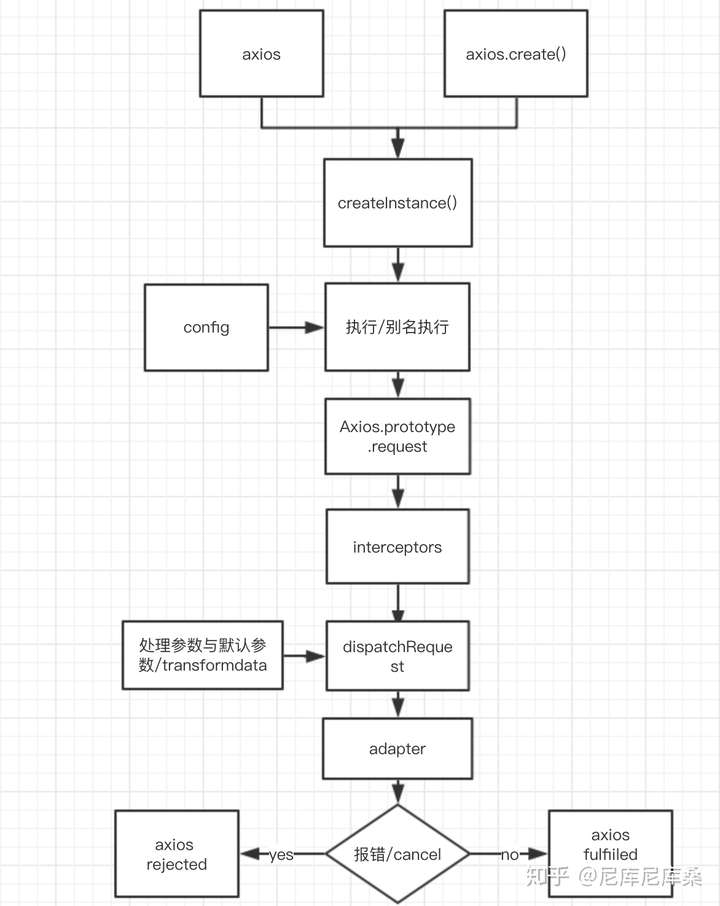 通过以上入口方面分析我们可以看出端倪, axios 入口其实就是通过 createInstance 创建出的实例和 axios.create() 创建出的实例一样。而源码入口中的重中之中就是 createInstance 这个方法。createInstance 流程大致为: