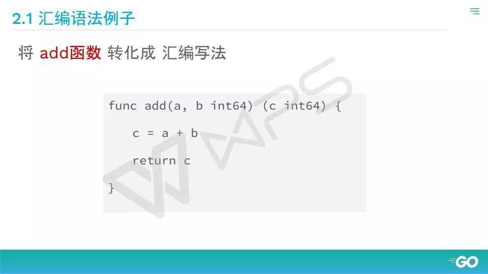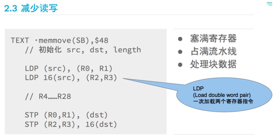 非常简单,但是大家最好不要这么写,为什么?我用Go写,就一行的事情。你用汇编写内存动来动去,还要算来算去,千万不要用汇编写复杂语言,这很困难。还记得,我们刚才讲的三个汇编优化目标,减少读写、并行操作、硬件加速。