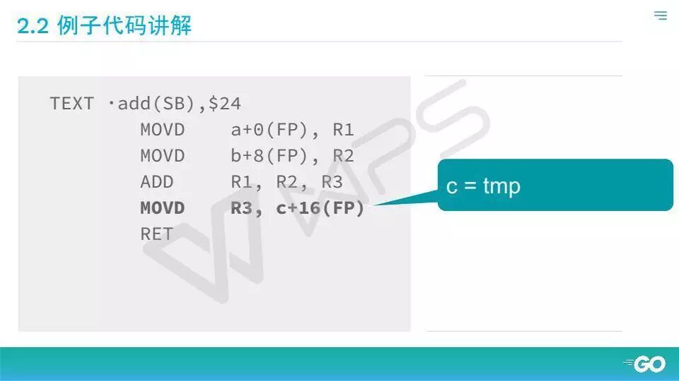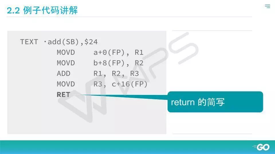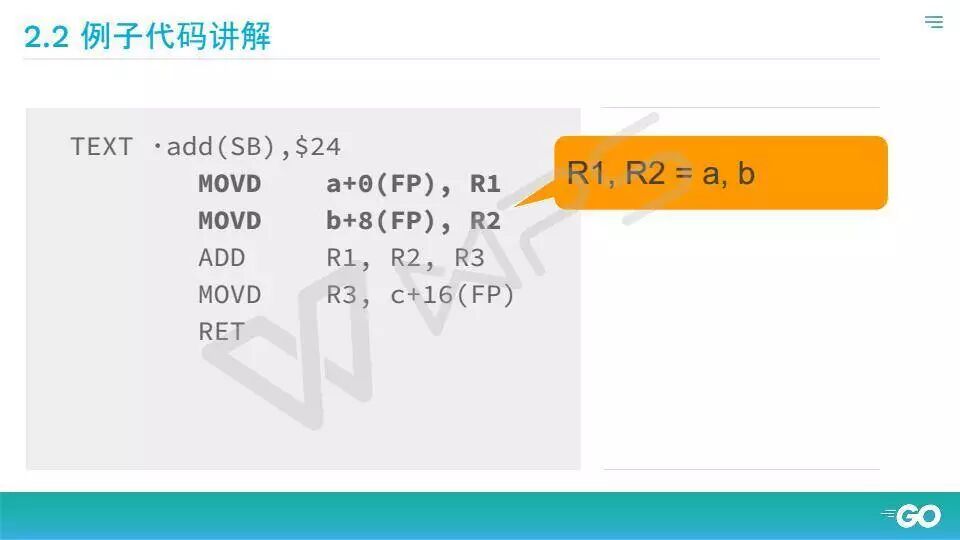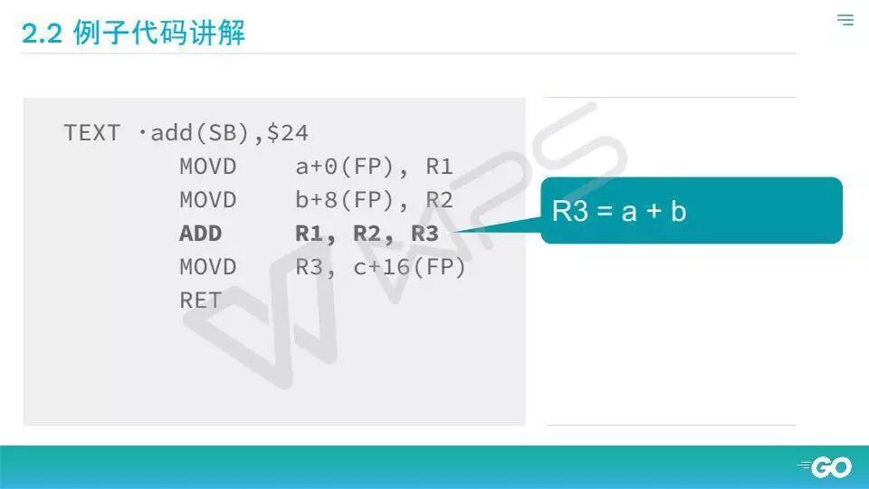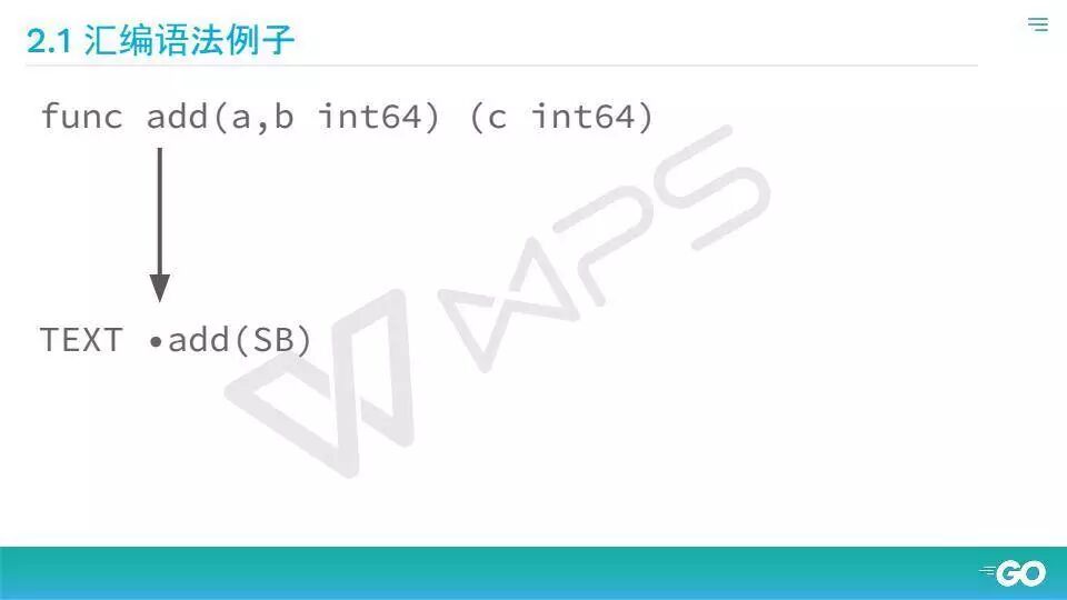 Go 的汇编语法其实很简单,它是准抽象的汇编语言,为什么叫准抽象?Go 本来的汇编语言是希望大一统,有什么X86-64,Arm64,大家只要写一种汇编语言就可以。实现起来后发现大部分做不到,最后只能保留差异,统一了风格,再输出机器码,所以叫准抽象的汇编语言。再有就是它的AT&T的风格,从左到右的写法,就是指令级在最左边,中间设几个参数,然后放目标寄存器或者目标,其他的嘛,各个平台就完全不一样了。