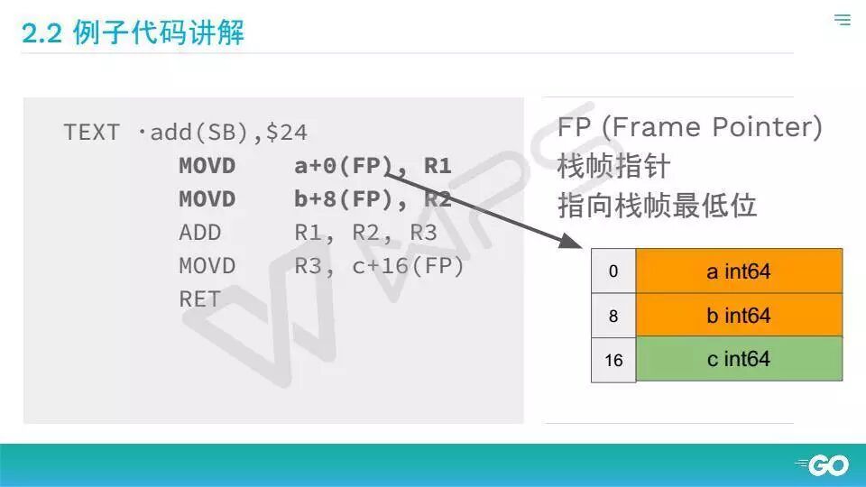 还记得例子里刚才我们看到三个参数,abc,都是 int64,一个 int64多少字节?8个字节哈,所以这个栈帧长24个字节。注意这里有对齐的问题,其他平台不一定是24,不过为了简单理解,我把24放到这里来。
