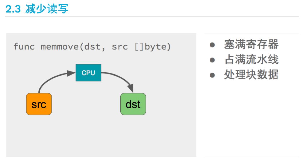 比如 memmove,Go 内建函数 copy,很简单,把一片数据从原地址挪到目标地址,最简单的做法是一个一个搬,从原地址挪8个字节,再搬8个,存进去,再搬8个字节出来,一直循环完为止。这里面会有什么问题?