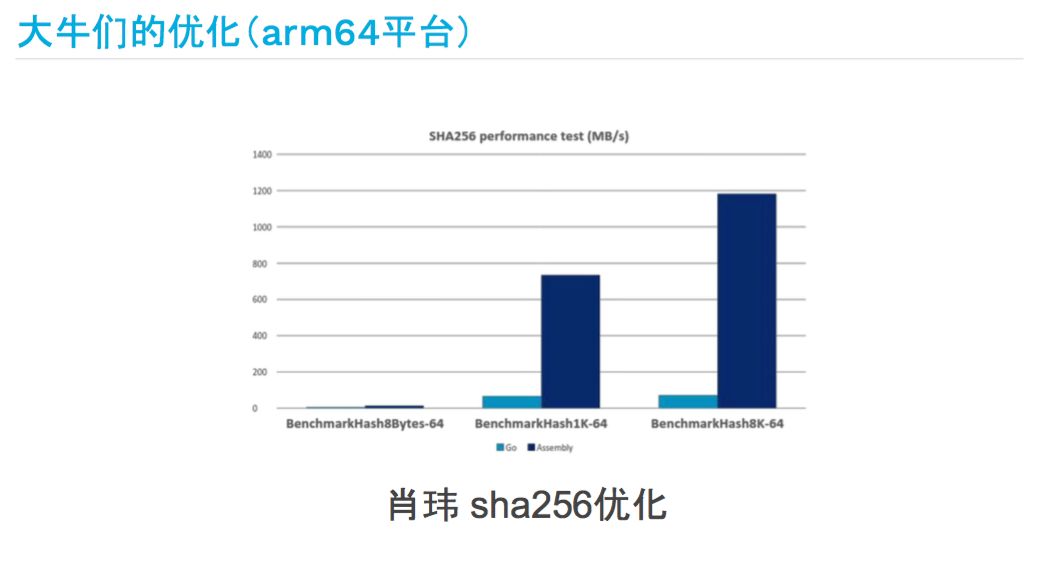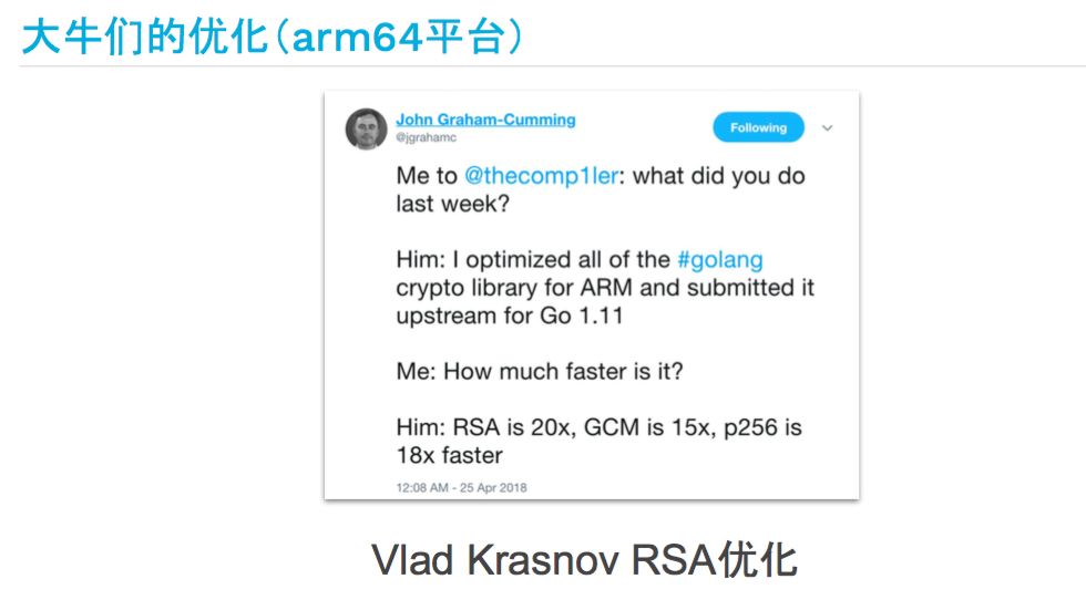 国内 arm 公司的大牛肖玮带领他的团队也在做 Go 相关的优化,比如 sha256,提升的效率有 16倍。国外的也有,Cloudflare,做CDN的公司,他们有一个密码学大牛弗拉德做了一些优化,也在 Go 的1.11里面合进去了,优化的效率是多少呢?