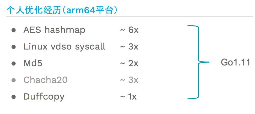 我给 Go 的 1.11 提交了这几个项目,第一个是 Hashmap 优化,就是你们常用的 map 操作里面最费时的哈希值计算优化。VDSO,虚拟动态对接的 syscall,主要是优化系统时间调用。Md5、Chacha20就不说了。还有一个 Duffcopy,这是给编译器展开优化用的,它在 arm64平台优化得不是很好,所以我也做了优化。除了 Chacha20还没有完成外,其他的都已经在 Go master 上可以用到了。可能有些人会觉得为什么都是 arm64 平台的优化?其实就是 Go 官方团队维护了 X86-64,已经优化得很好,我就不要搀和了,就挑了一个比较新的平台,arm64。