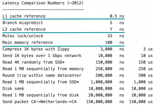 上图是谷歌的 Jeff Dean 分享的《程序员应该知道的延迟》,这个延迟是什么延迟呢?比如数据从CPU L1里面挖出来的速度,在2012年的时候是0.5ns,CPU L2里面是7ns;储存,也就是我们常说的内存里面拉出来是100ns。大家有没有发现每多一层就是10倍的性能下降,所以你要尽量少用内存的操作,多用寄存器。还有,CPU访问内存的时候有一个小窍门,把这个对齐再访问,CPU会执行得更快一些。这些都是基本知识,大家可以百度、Google 一下,不展开。