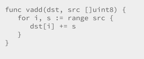 给大家举个例子。很简单,一个 uint8的 slice,你把它加起来,放到dst里面,把这个slice的数据全部加起来。这里数据比较复杂,所以我要给大家做一个Demo给大家看。