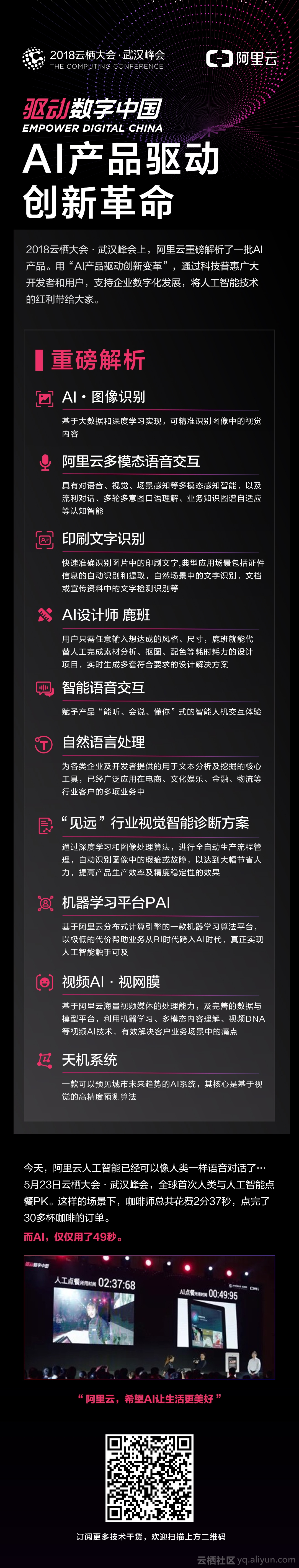 5月23日,2018云栖大会·武汉峰会上,阿里云首次曝光了人工智能产品家族,全方位公开AI产品体系(详见ai.aliyun.com),通过一张图来了解下。