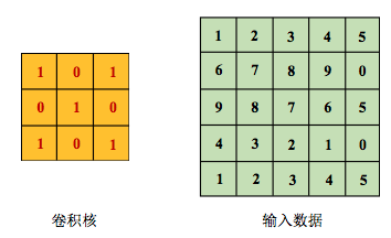 卷积运算实际是分析数学中的一种运算方式,在卷积神经网络中通常是仅涉及 离散卷积的情形。下面以 Dl = 1 的情形为例介绍二维场景的卷积操作。假设输入图像(输入数据)为如图2.3中右侧的 5 × 5 矩阵,其对应的卷积核(亦称卷积参数,convolution或convolution)为一个 3 × 3 的矩阵。同时,假定卷积操作时每做一次卷积,卷积核移动一个像素位置,即卷积步长 (stride)为1。