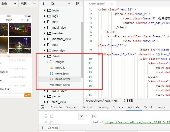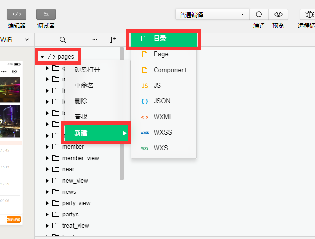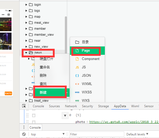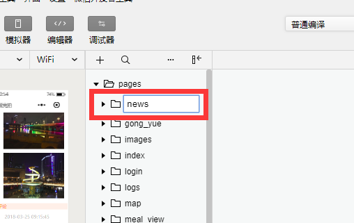 1.先在微信开发者工具中新建目录,如news,完整路径是:/pages/news/