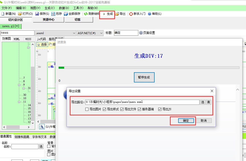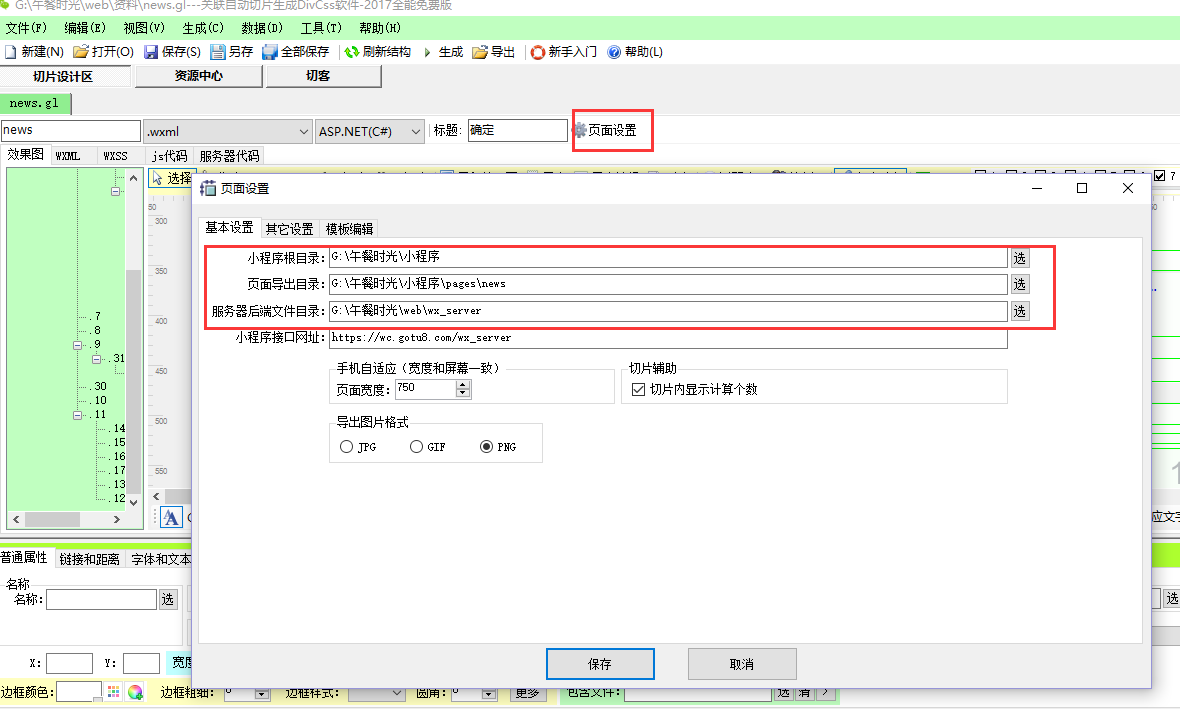 3.再在我们的切片软件中,找到页面设置,设置好小程序的根目录、导出目录、和服务器端目录及接口网址,如: