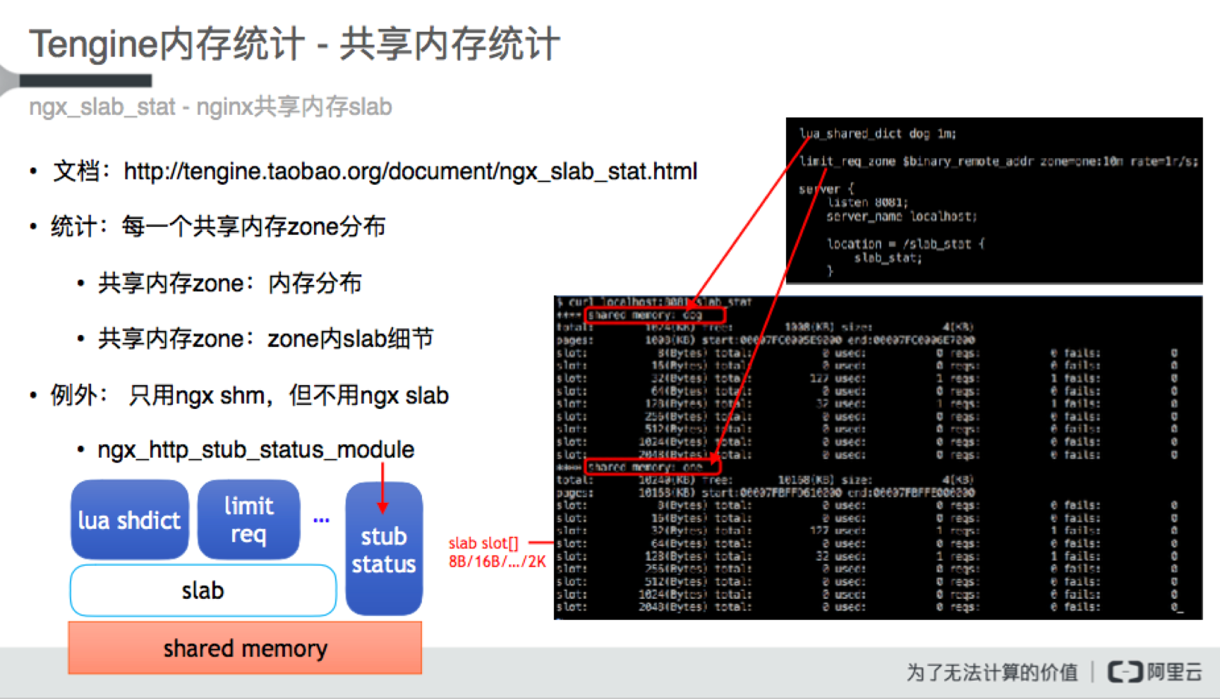 Tengine是多进程服务模型,其进程间的通信主要依赖操作系统共享内存机制,随着业务的发展共享内存的使用频率越来越高,如何去定位、调试共享内存,是一个比较严峻的问题,且业内缺少相关工具。我们在调试共享内存问题时,沉淀和开源了mod_slab_stat工具,在Tengine社区可以查阅详细的文档,该工具统计和展示了每个zone的内存分配细节,包括page、slab和alloc num等,突出业务通信内容块分布情况等。该工具适用于ngx shm,基于ngx slab的stub stats模块是个例外。