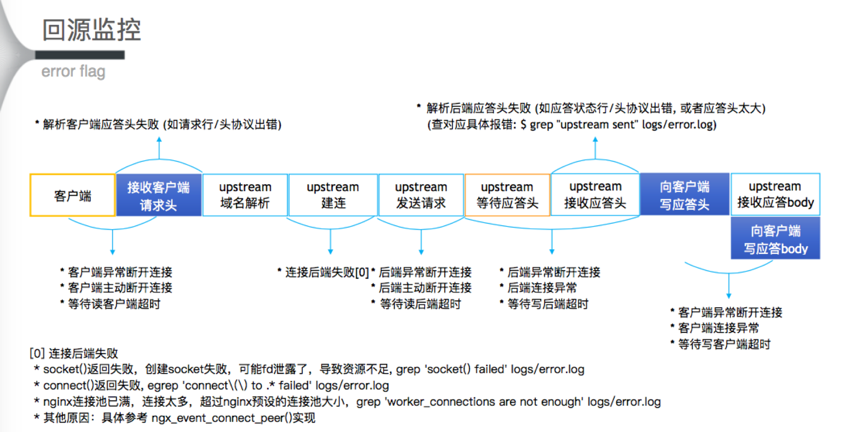 在上面的章节中,我们已经分析过如何依靠Tengine提供的关键指标来衡量和监控请求卡顿,那么,我们同样可以提出问题:如何去分析请求代理或回源失败?是因为客户端主动断连、后端异常还是请求超时?如何去分析真实的原因,从而实时监控回源失败,这也是经常困扰CDN用户和开发人员的难题。