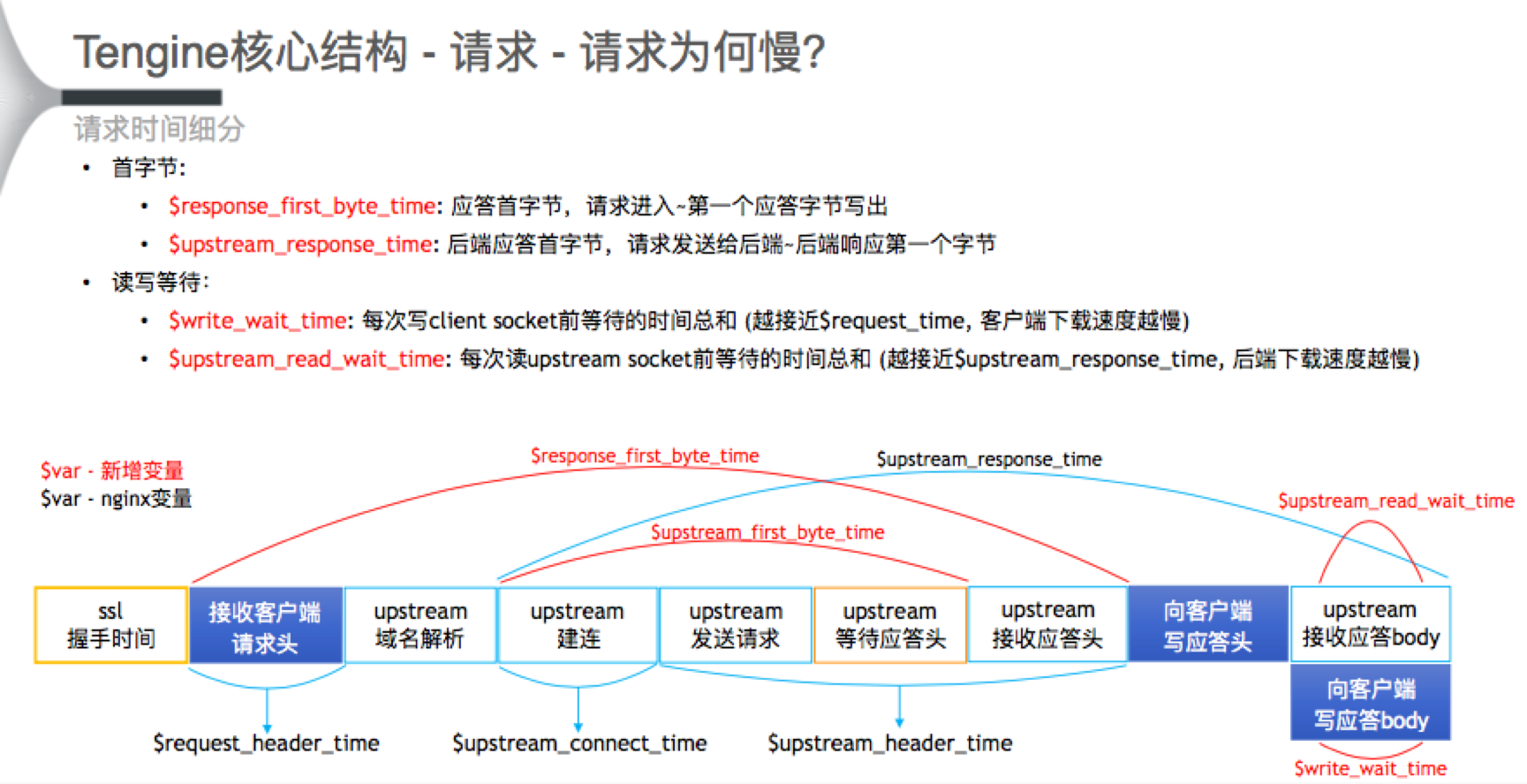 Tengine新增了responsefirstbytetime、responsefirstbytetime、upstream_response_time、writewaittime、writewaittime、upstream_read_wait_time等变量来记录从请求进入到响应结束整个请求流程中的包括不限于应答首字节、后端应答首字节、socket读写等待时间总和等关键指标。