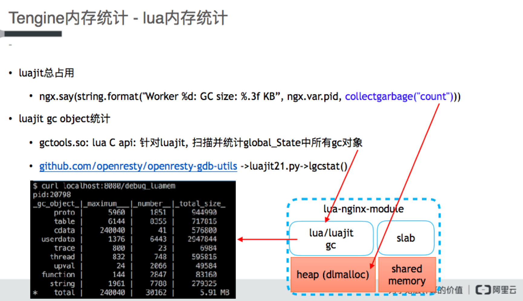 lua/luajit是另一个非常成熟的开源项目,在nginx生态系统中,lua-nginx-module允许lua/luajit以虚拟机形式内嵌到nginx提供强大的脚本能力,我们在阿里云CDN海量业务开发中大量使用到lua/luajit。在调试luajit内存占用时,可以通过collectgarbage来展示总内存占用量,通过扫描gc object,可以统计global_State中所有gc对象,OpenResty社区也提供了GDB工具来输出gc对象的数量和内存占用。