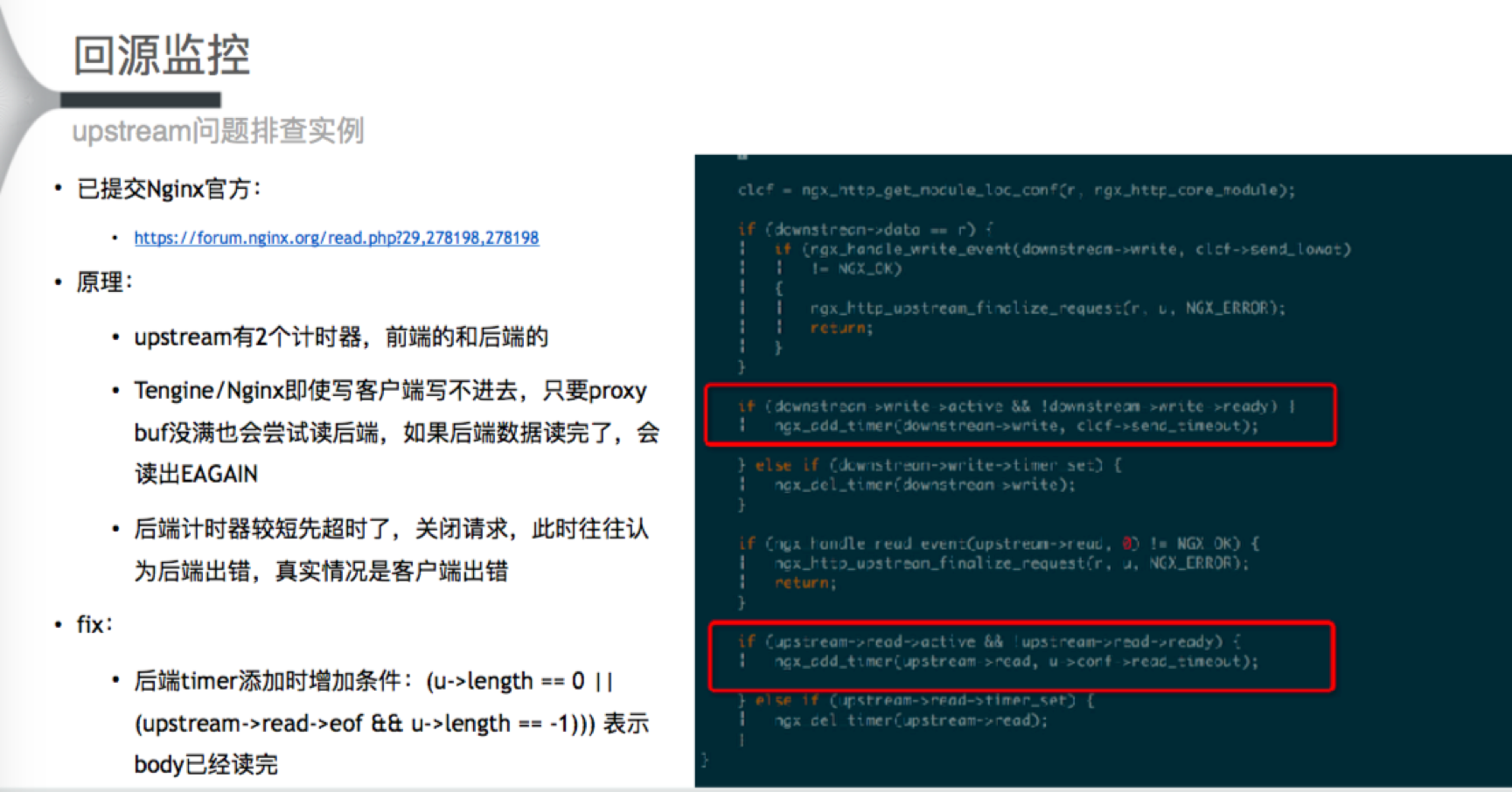 这个特殊实例,在某些场景下,甚至在很多的生成环境中,都是比较常见但却往往被忽视的问题,在帮助提升用户体验和服务质量的目标下,即使是nginx核心代码不易发现的bug,在完善的调试工具和回源监控下,一样无所遁形。有兴趣的同学可以搜索nginx邮件列表来详细了解问题背景,虽然nginx 官方因为一些原因没有合入该patch,我们在Tengine中也做了单独的优化策略。