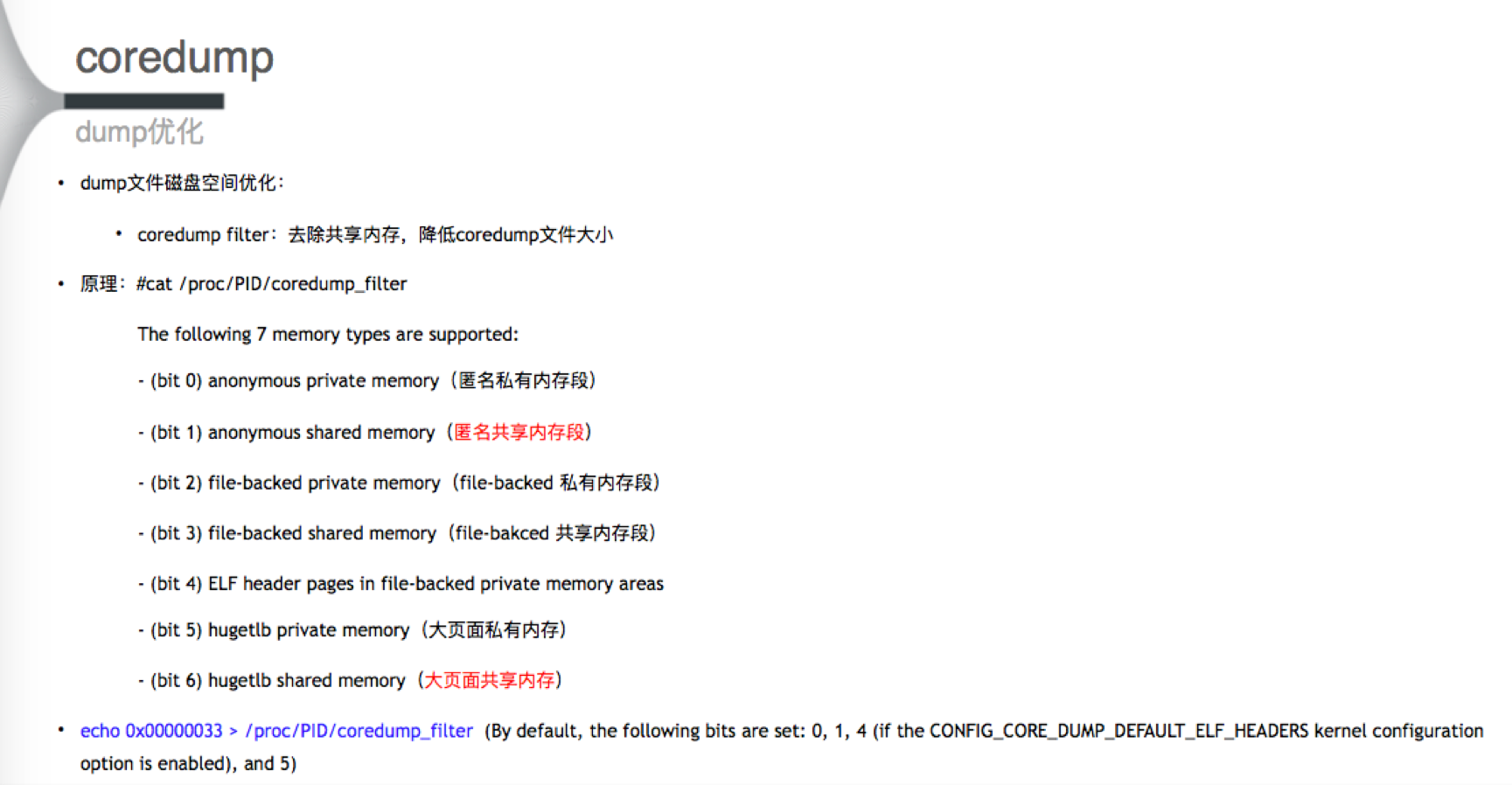 “cat /proc/PID/coredump_filter”这行指令帮助我们了解Linux操作系统coredump机制所支持的内存形态,包括私有内存、共享内存等。我们在使用Tengine时可以去除共享内存,降低coredump文件大小。同时,也可以限制一定时间内crash写coredump文件的次数,防止磁盘IO过高或磁盘空间被占满,Tengine提供了“worker_core_limit”指令(待开源)来限制至分钟/小时/天级别。