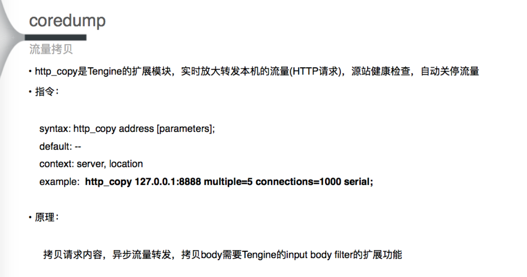 事后诸葛只能查漏补缺,我们需要提前发现问题,实时流量拷贝工具应运而生。http_copy是Tengine的扩展模块,可以实时放大转发本机的流量(HTTP请求),可以配置放大流量到指定地址和端口,也可设置放大的倍数和并发量等,更可以通过源站健康检查来自动关停流量,避免过大流量对Tengine和源站的正常服务造成影响。