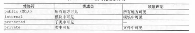 可见性修饰符public 全部可见,private 类或者文件内可见,propected子类可见,还有一个模块可见。