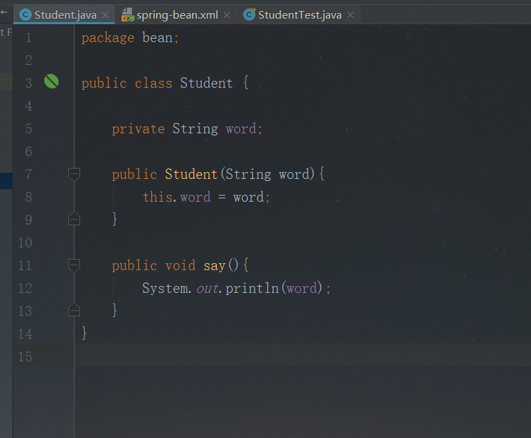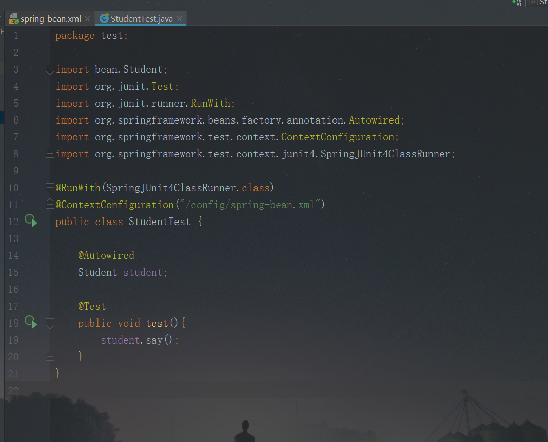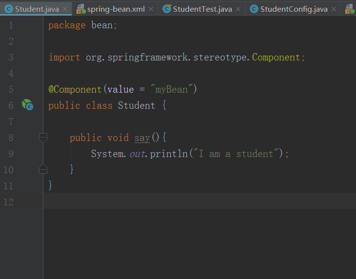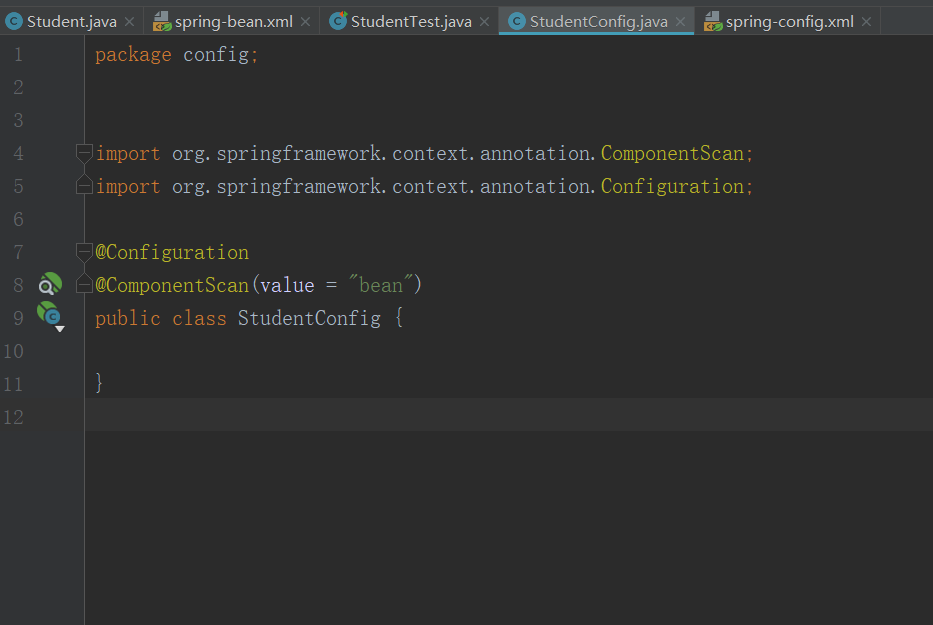 如果不填写参数,就扫描此文件所在的包,在这里,我们扫描名为“bean”的包,点击注解左边的那个按钮就能跳转到 Student 类(bean 包中)