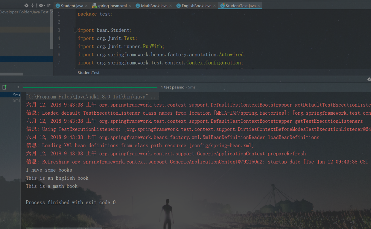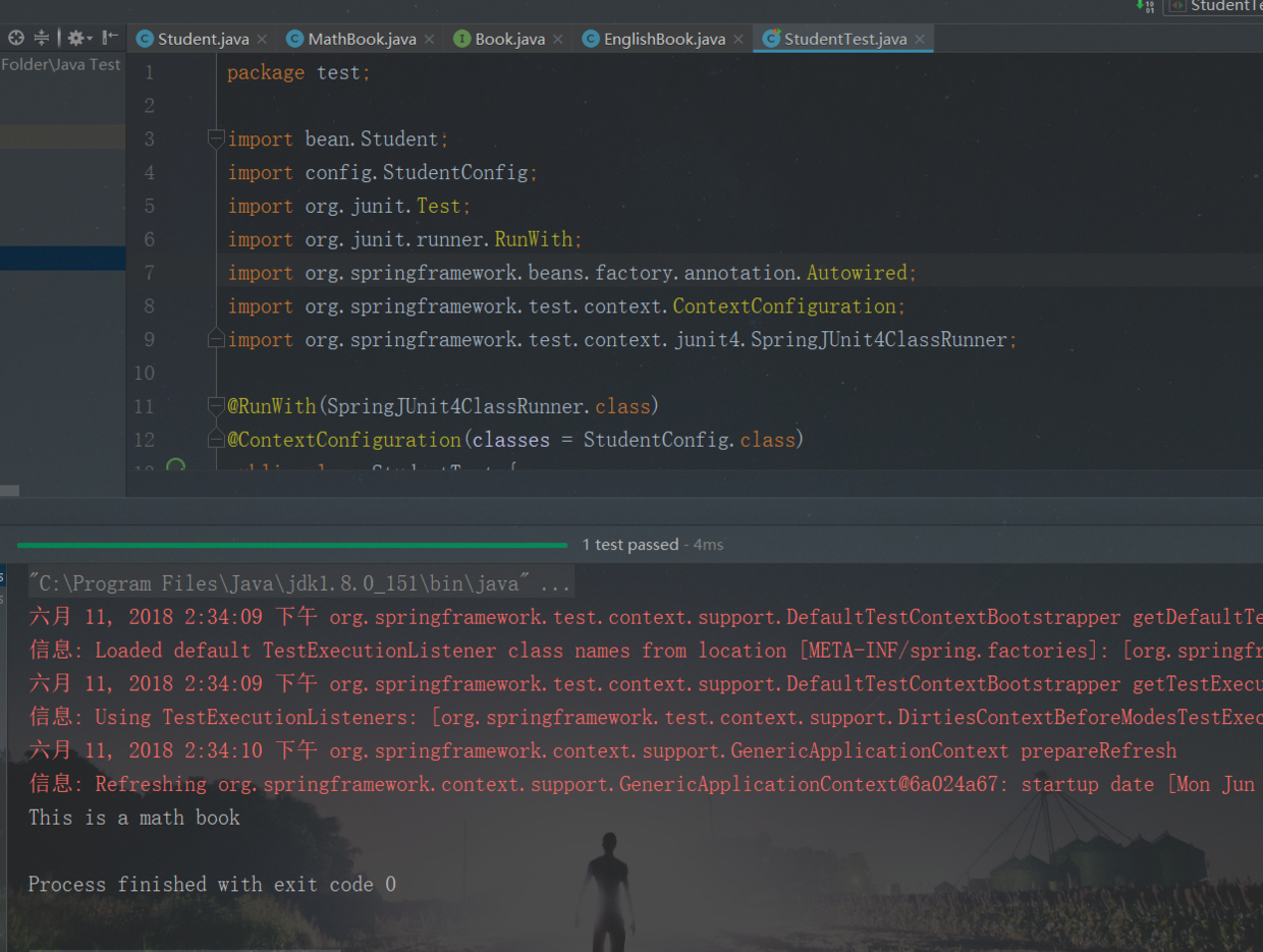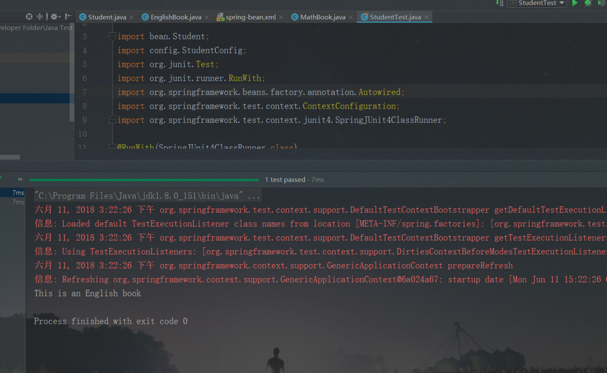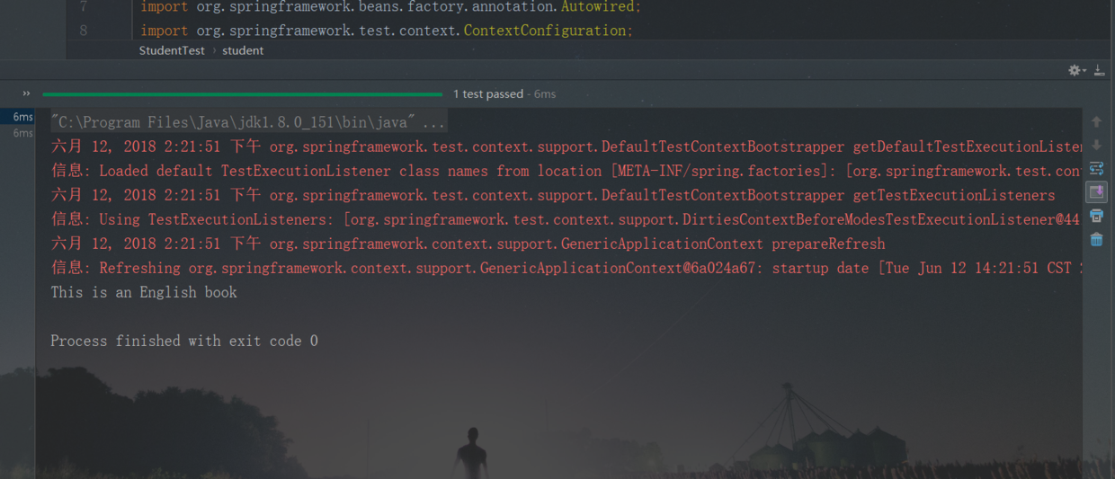在 student 中使用构造器注入了 englishBook 这个 Bean,运行测试,将会得到英语书的输出: