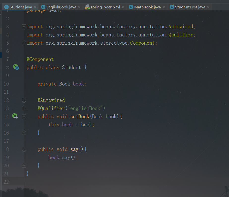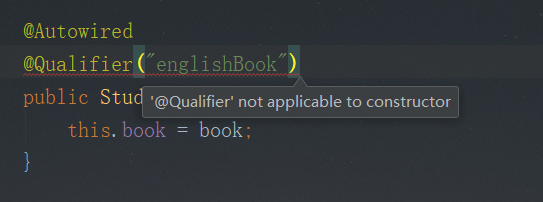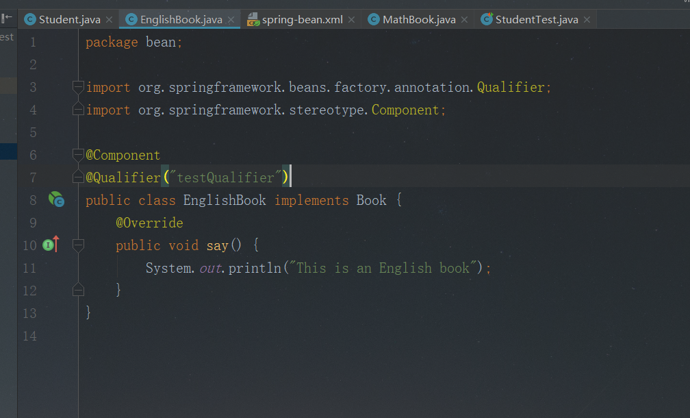 这时候,如果还使用 englishBook 作为限定符,也能够定位到这个 Bean,但是我们用自定义的限定符也可以,修改 Setter 方法上的限定符,进行测试: