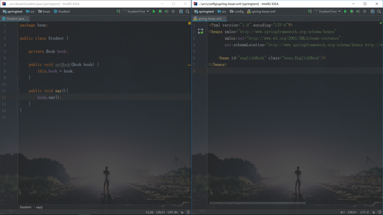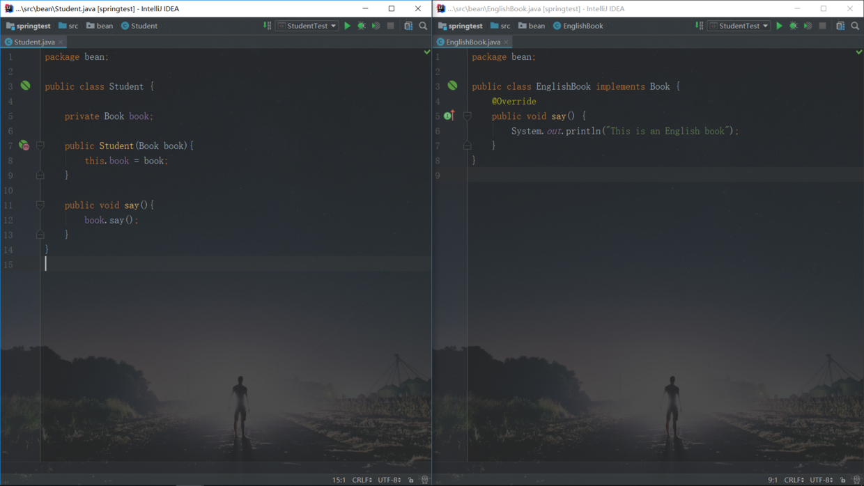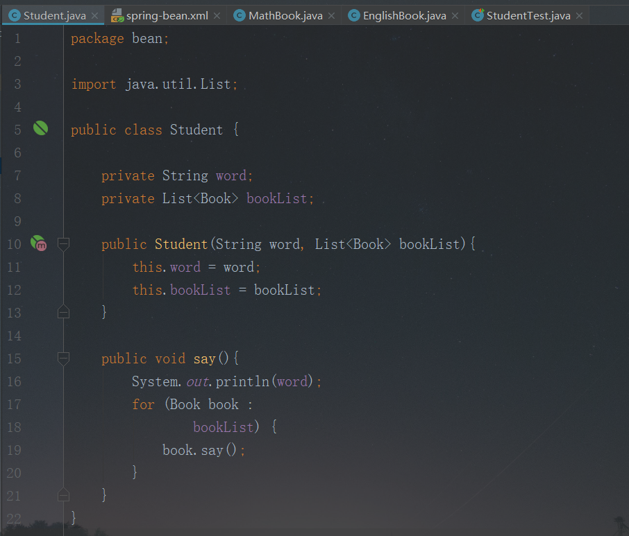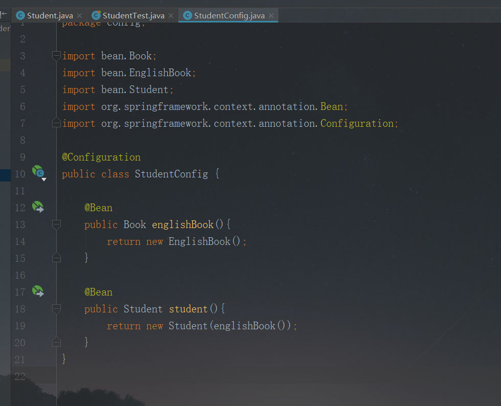 在构造 Student 的时候,我将一个 Book 类注入,因为我们刚才已经有了 Book 类的实现,所以这里注入的是 englishBook 这个 Bean