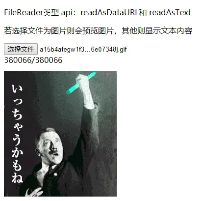 - 接下来,若读取的文件为图片,使用readAsDataURL将其转化为图片,否则转化为text。 相应的转化结果会保存在result中。
