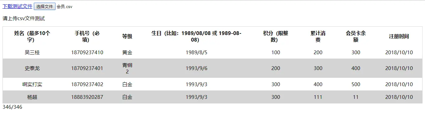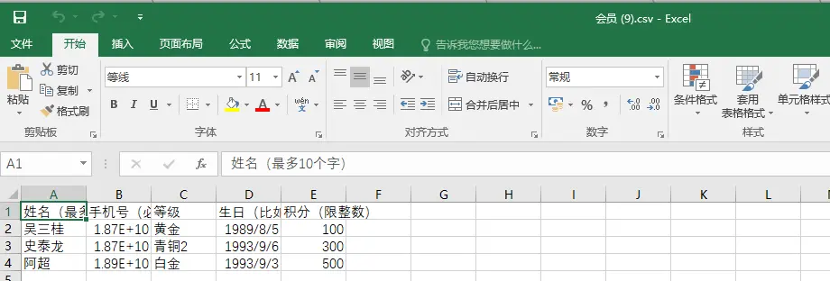 ['姓名(最多10个字)', '手机号(必填)', '等级', '生日(比如:1989/08/08 或 1989-08-08)', '积分(限整数)']