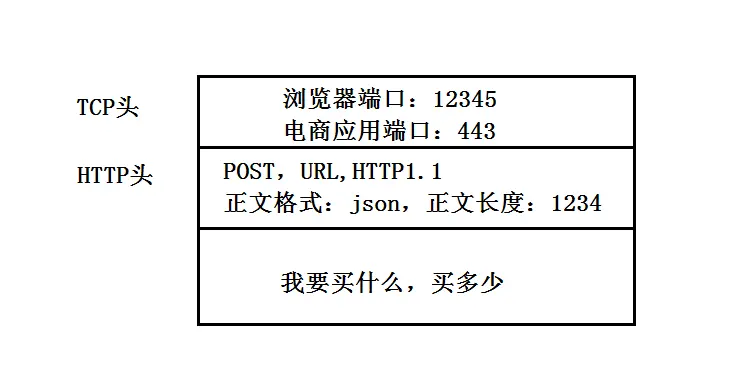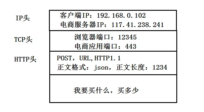 TCP协议里面会有两个端口,一个是浏览器监听端口,一个是电商的服务器监听端口。操作系统往往通过端口来判断,它得到的包应该给哪个进程。(HTTP默认是80,HTTPS默认是443)
