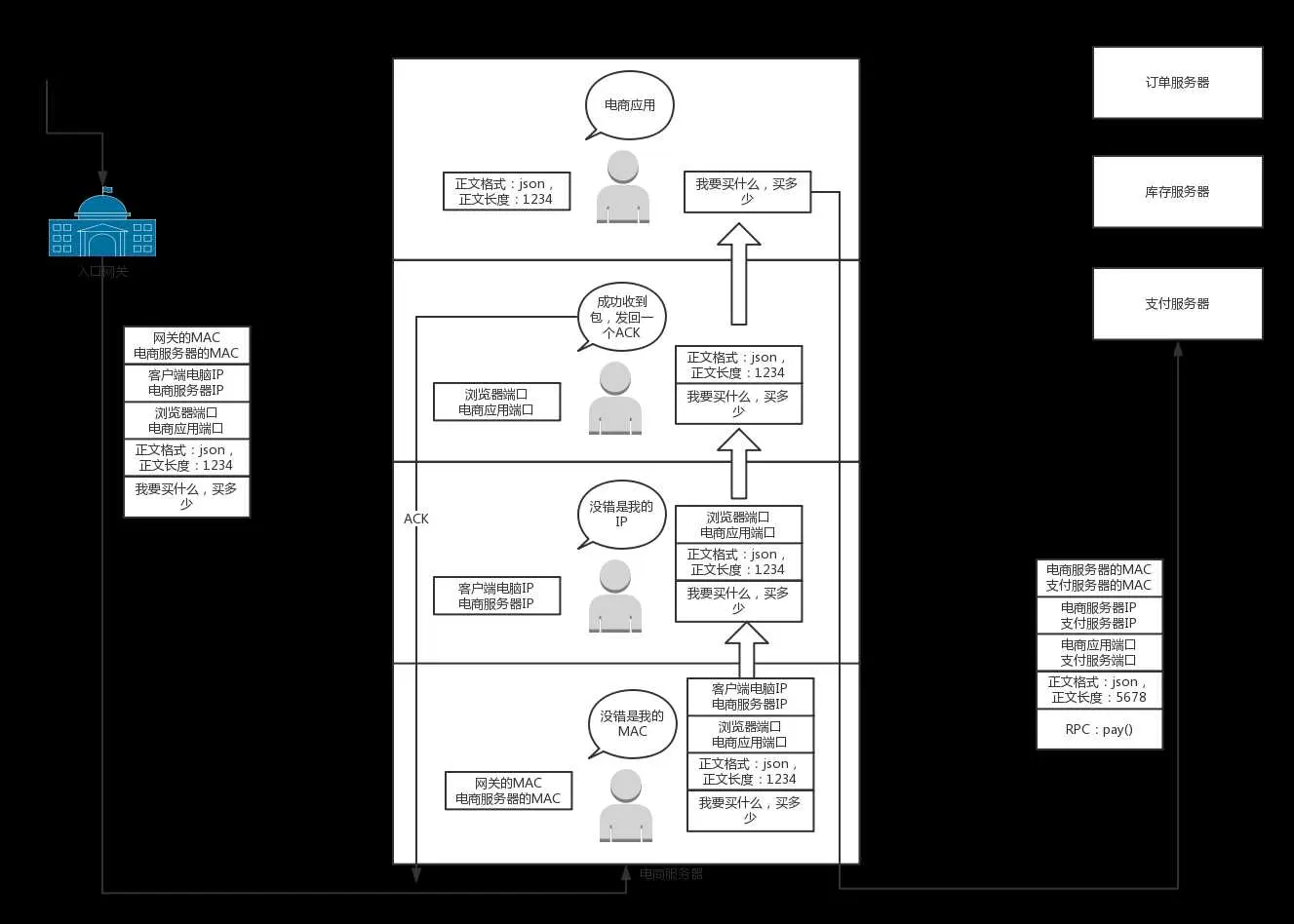 在这一层里,对于收到的每一包,都会有一个回复的包说明收到了。这个回复的包绝非这次下单请求的结果,例如购物是否成功啊,扣了多少钱啊...而仅仅是TCP层的一个说明,即收到之后的回复。当然这个回复,会沿着刚才来的方向走回去,报个平安。