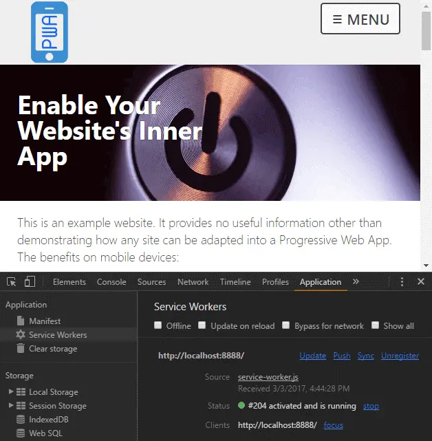 本示例中提供了一个有四个网页的网站,一个CSS文件和一个JavaScript文件。这个网站可以在所有的现代浏览器上正常工作(IE10+)。如果你的浏览器支持渐进式Web应用,用户可以在离线状态下将会直接访问缓存中的页面。