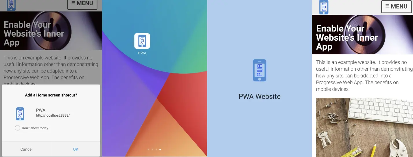 你可以使用浏览器的“添加到主屏幕”功能将当前网页添加到主屏幕,在你访问了几个页面之后,浏览器会将这个Web应用“安装”到你的设备上。浏览几个页面,关闭Chrome并将设备与电脑断开连接,点击桌面上生成的图标,你会看到一个Splash页面,并且你可以继续浏览之前浏览过的页面。