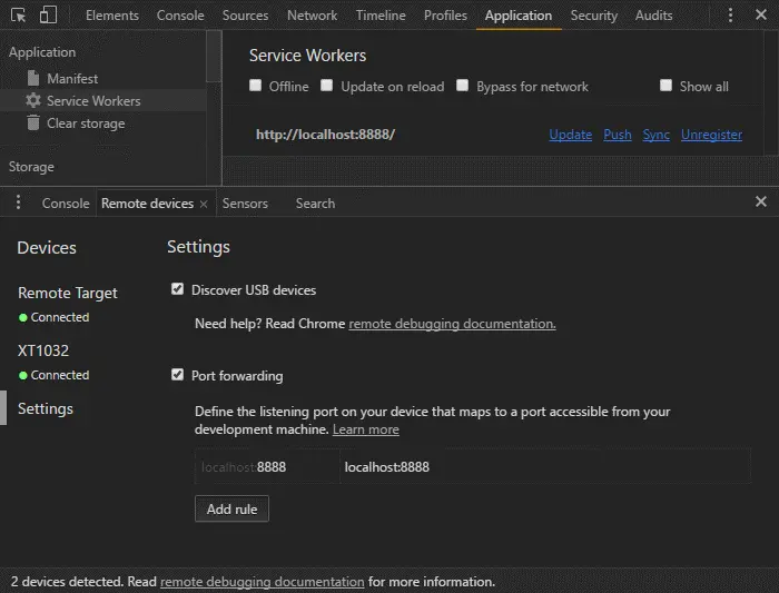 除了在PC浏览器访问外,你也可以在移动设备上访问该示例。使用USB线缆将你的移动设备连接到电脑上,然后从右上角三个点菜单中打开More tools - Remote devices标签