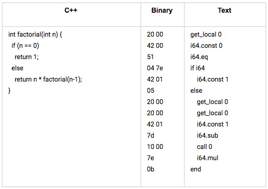 WebAssembly 同时存在一个二进制格式和一个文本的描述格式,这很像是机器语言和汇编语言的关系。这里我们用一个例子解释一下。