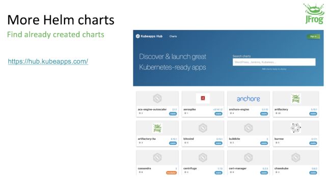 Helm 的使用方式及其简单,使用命令 Helm install Artifactory 即可部署一个 Artifactory 应用到 Kubernetes 里,也可以用同样的方式很多其他的应用,比如 Jenkins 等等。