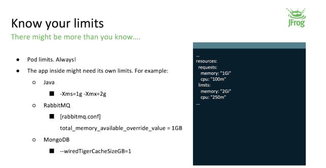 由于我们每个研发,每个分支都有独立的 Kubernetes 环境进行容器化的部署,一旦研发开始大规模的测试,资源必然会有出现瓶颈的时候。所以一定要对 Pod 进行资源的限制。同时,对 Pod 里的应用也需要进行限制,例如 Java 的内存限制,MQ 和 Mongo 的内存限制。