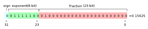0.15625转换为二进制数是0.00101,用科学计数法表示就是 1.01 * 2^(-3),所以符号位为0,表示该数为正。注意,接下来的8位并不直接存储指数-3,而是存储阶数,阶数定义如下: