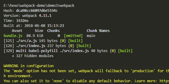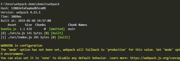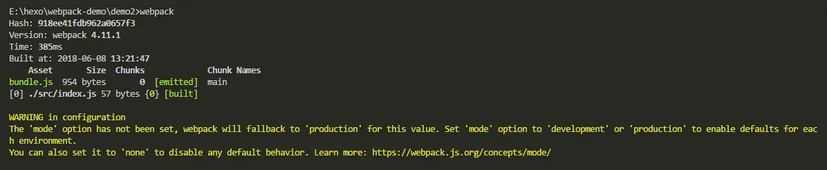 在项目的demo2目录执行webpack。如下图就代表打包成功。打开demo2下面的index.html 就可以弹出我的博客地址。