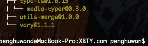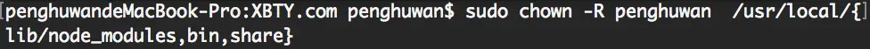 什么时候用本地/全局安装? 1.当你试图安装命令行工具的时候,例如 grunt CLI的时候,使用全局安装 全局安装的方式:npm install -g 模块名称 2.当你试图通过npm install 某个模块,并通过require('XXX')的方式引入的时候,使用本地安装 本地安装的方式:npm install 模块名称 你很可能遇到的问题在你试图本地安装的时候一般都会遇到permission deny的问题 例如我这里第一次尝试全局安装express,输入npm install -g express【吐槽】而且让人无语的是在安装了许多依赖后才提醒你权限不够... 解决方式: 1. sudo npm install -g XXX ,以管理员的身份安装 评价:每次都要输入账号和密码,非常繁琐,且官方并不推荐( You could also try using sudo, but this should be avoided) 2.sudo chown -R 你的账号名 npm所在目录的路径 /{lib/node_modules,bin,share} 评价:官方推荐的做法,chown全称为change owner,即将npm目录的所有者指定为你的名字(授予权限),-R表示对指定目录下所有的子目录和文件也都采取同种操作。 <1>首先,通过 npm config get prefix获取npm所在目录的路径,例如像这样: