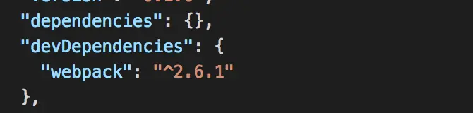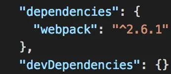 安装成功 3.sudo chmod 777 npm所在目录(不推荐) 评价:这是网上经常能够看到的解决方式,但,官方教程里没有对此有任何提及。chmod代表change mode更改读写模式,对该目录授予最高权限,任何人可读可写,这是很危险的 本地安装的时候,将依赖包信息写入package.json中 注意一个问题,在团队协作中,一个常见的情景是他人从github上clone你的项目,然后通过npm install安装必要的依赖,(刚从github上clone下来是没有node_modules的,需要安装)那么 根据什么信息安装依赖呢?就是你的package.json中的dependencies和devDepencies。所以,在本地安装的同时,将依赖包的信息(要求的名称和版本)写入package.json中是很重要的! npm install 模块:安装好后不写入package.json中 npm install 模块 --save 安装好后写入package.json的dependencies中(生产环境依赖) npm install 模块 --save-dev 安装好后写入package.json的devDepencies中(开发环境依赖) 示例: 我在项目下安装webpack:进入项目终端输入npm install 安装完毕后我的package.json