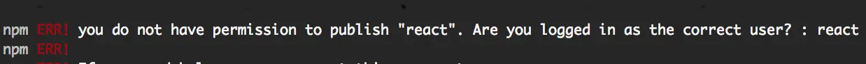 在终端输入npm login,然后输入你创建的账号和密码,和邮箱,登陆 【注意】npm adduser成功的时候默认你已经登陆了,所以不需要再接着npm login. 例子: (因为我已经创建过账号了,所以直接登录) 1.进入项目目录下,然后再登陆:【注意点1】不能和已有的包的名字重名! 例如我尝试把包名改成'react'显然已有的包: