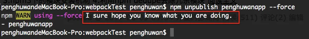 这里要说一点,取消发布包可能并不像你想象得那么容易,这种操作是受到诸多限制的,撤销发布的包被认为是一种不好的行为 (试想一下你撤销了发布的包[假设它已经在社区内有了一定程度的影响],这对那些已经深度使用并依赖你发布的包的团队是件多么崩溃的事情!) 示例: 我现在将之前发布的包penghuwanapp撤销掉:输入npm unpublish 包名【吐槽】注意看红框框住的字,你就知道npm官方撤销已发布的包对这种行为的态度了....