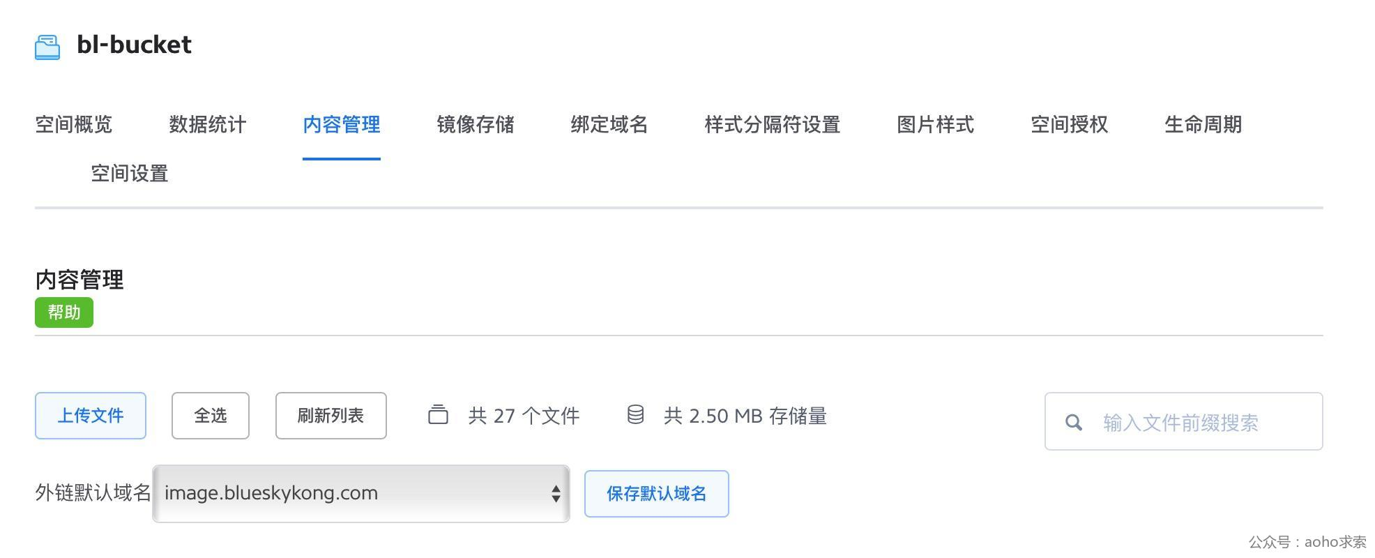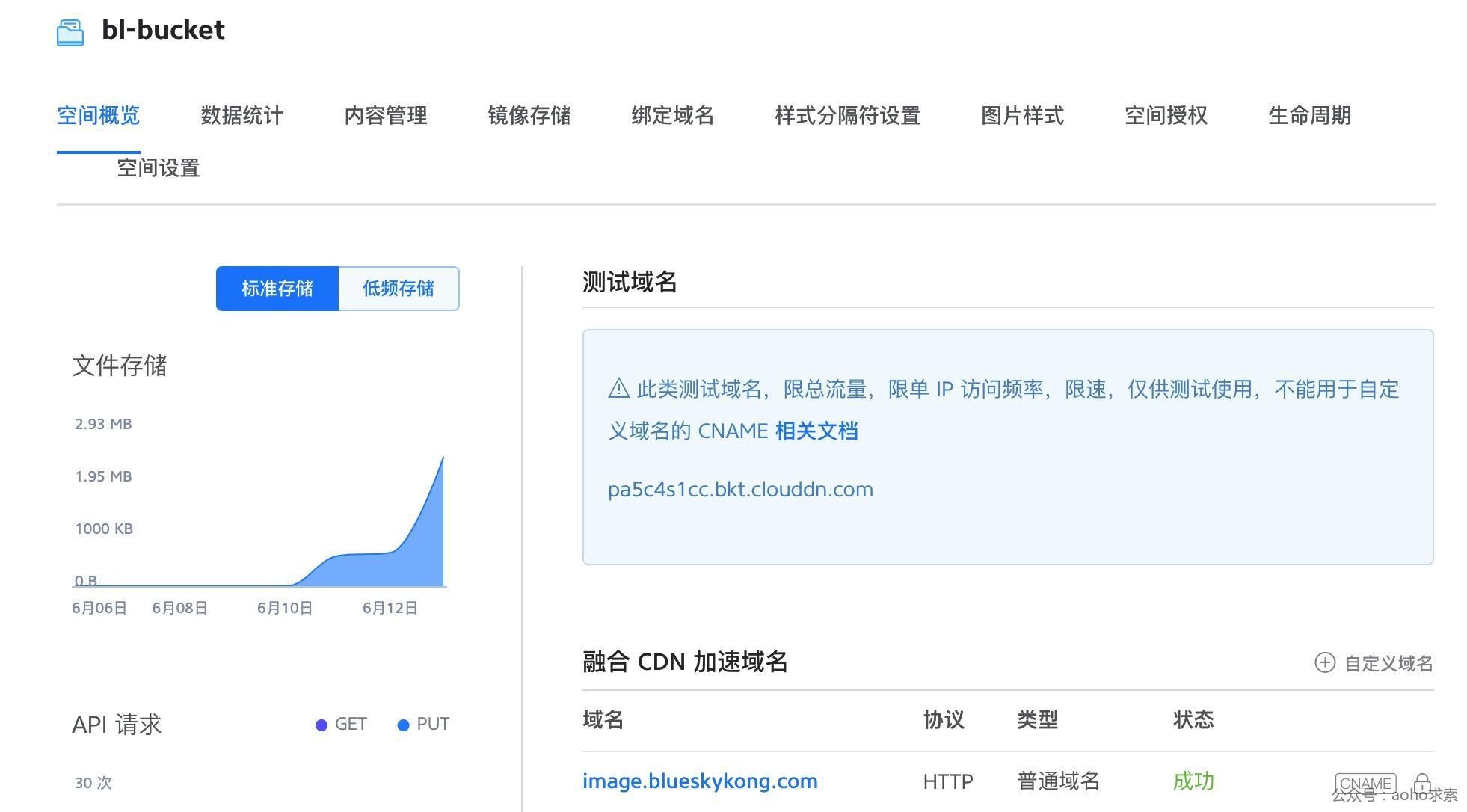 在上图中,还可以看出笔者绑定了域名http://image.blueskykong.com,这个可以自行选择,如果不绑定,可以使用测试域名。绑定域名之后,记得将该域名设为外链默认域名。