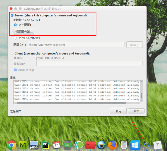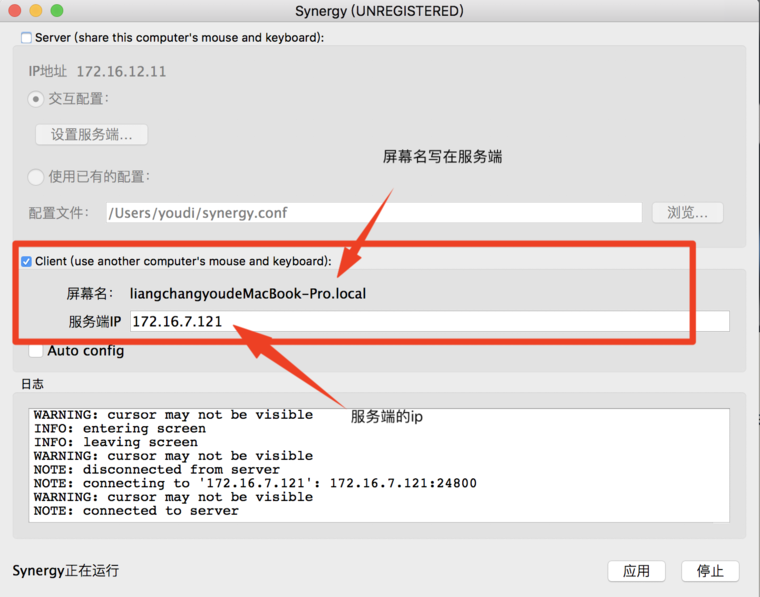 下面进入正式使用过程,Synergy是C/S架构,将键盘和鼠标共享出来的就是服务端。我的mac是type-c接口,所以没有接键盘和鼠标,所以只能是client。