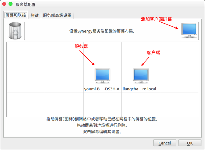 勾选client端选项,设置server IP (server端电脑的IP)切记保证两台电脑之间能够相互ping通,注意看到第一个红框里边的client端的名称,将其设置到前边提到的屏幕图标的名称中,切记!