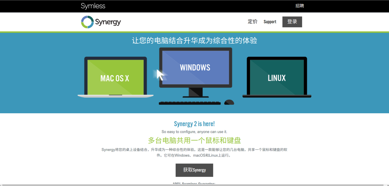 Synergy允许你轻松地在你办公桌上多台计算机之间共享你的鼠标和键盘。你只要将鼠标(指针)从一台计算机的屏幕边缘移出到另 一个屏幕就行了。甚至可以共享你的剪贴板。你所需要的仅仅是一个网络连接。Synergy是跨平台的(可以运行于Windows,Mac OS X和Linux)。