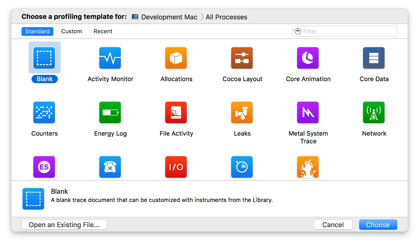 我们都知道 Instruments 中已经内置很多方便好用的工具了,这些工具苹果已经通过文档模板创建好并集成在 Instruments 的启动选择界面里。比如上文中提到的 Leaks 和 Time Profiler 相信很多人都有使用过,下图的就是 Instruments 10 的启动界面,与以前版本差别不大。