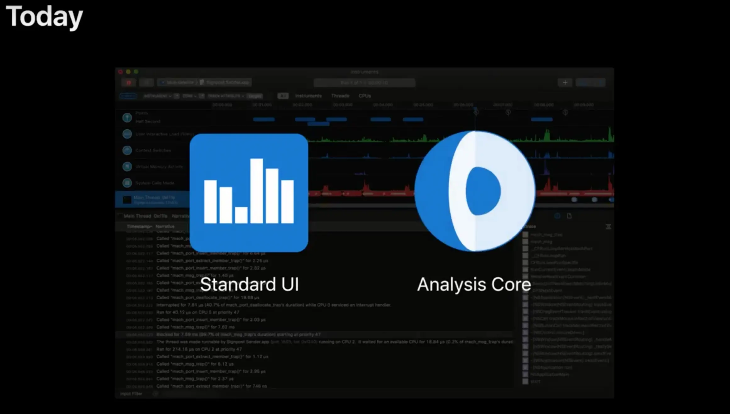 其中最重要的一点便是自定义自己的 Instrument 了,虽然以往的版本中也可以根据自己的需要去创建,但步骤麻烦且图形化支持简陋,并且因为数据采集是基于 DTrace 的,导致真机上并不能够使用,苹果自身也并不鼓励大家去做这个自定义。但 Instruments 10 针对这点这次可谓下了苦功——全新基于 os signpost 的架构能够支持所有平台,『标准界面(Standard UI)』 和 『分析核心(Analysis Core)』 使得自定义 Instruments 变得更加灵活而且便利。这个 Session 围绕如何创建一个自定义的组件,分为以下四个大部分展开: