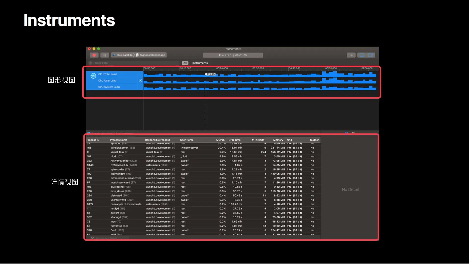 - Instruments 能够自动展示你代码里通过 OSLog signposts 标记的数据;