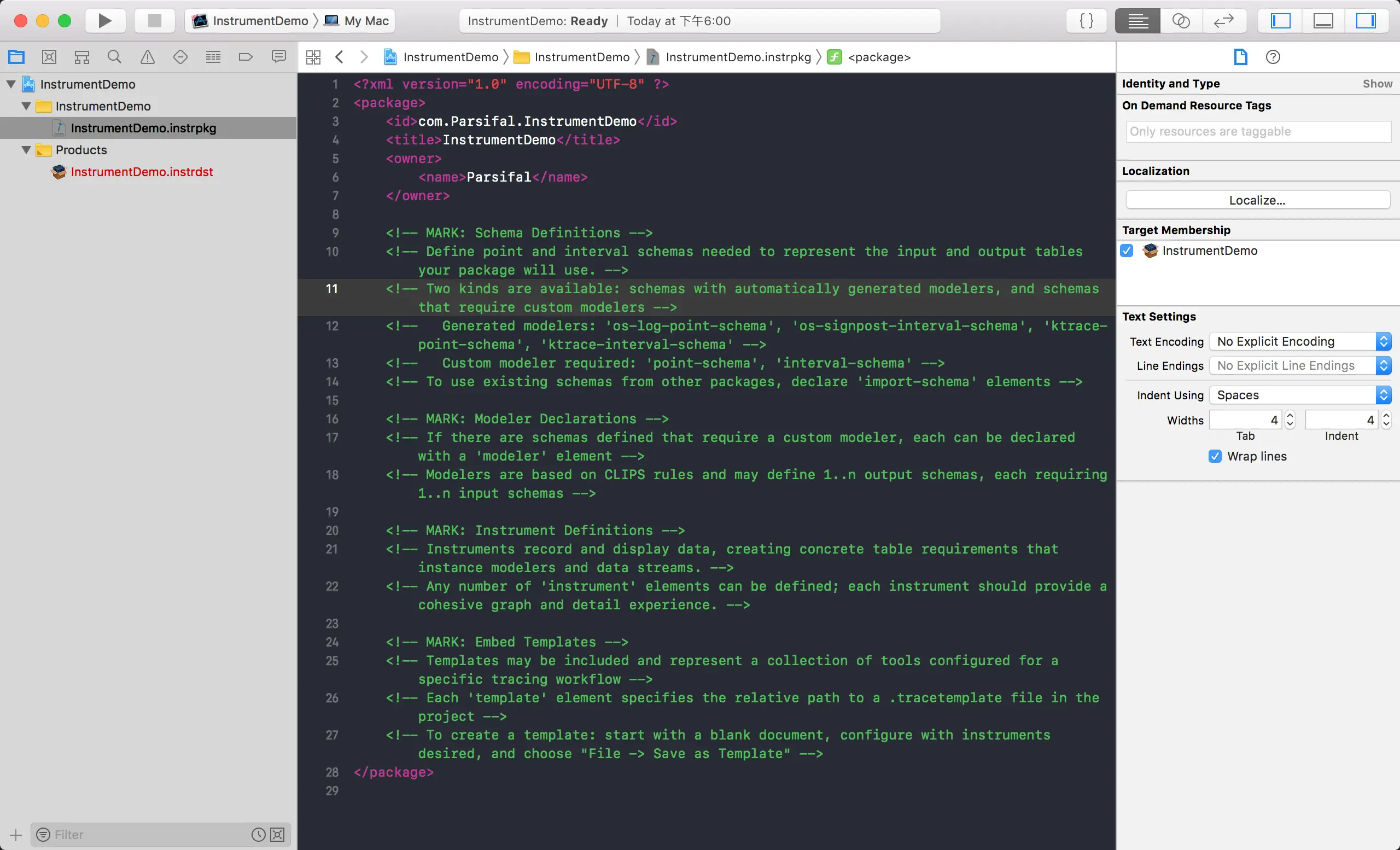 .instrpkg 的 XML 文件,所有的配置都会在这个 XML 文件中完成,其中默认已经帮我生成了包含一些基础信息。接着我们要做的就是按照我们的需要去写这个配置文档了。