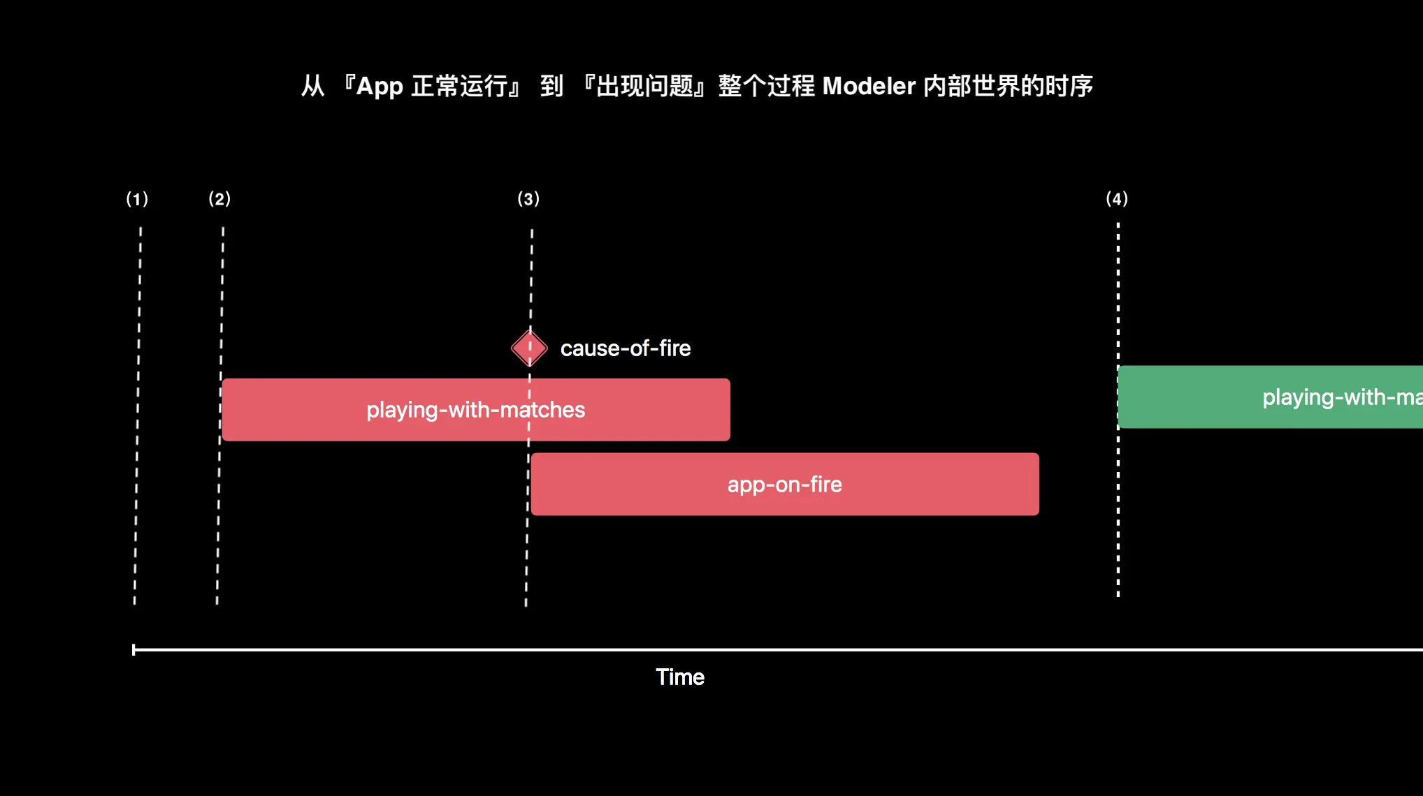 playing-with-matches中产生; app-on-fire在 t2 这个时间被触发了;- t1 的发生时间早于 t2;